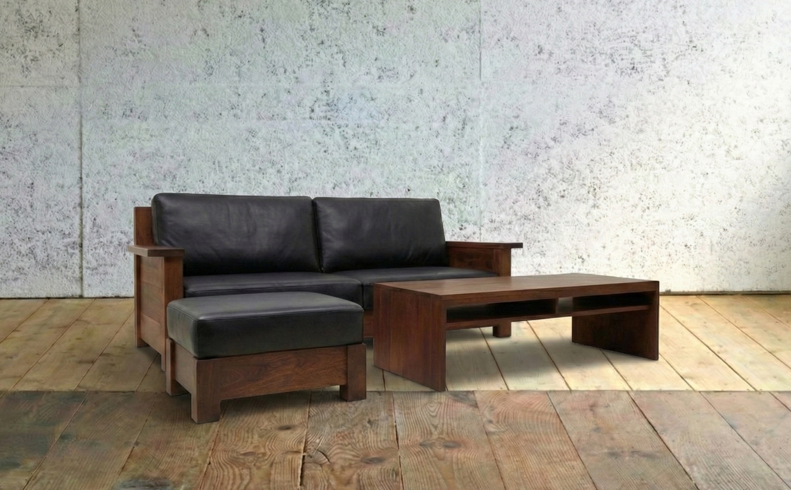 ウォールナットの無垢材で製作しています。釘を使わないホゾ組みで丈夫に美しく仕上げています。木の存在感をどこからでも味わえるソファーです。ピンが楔(クサビ)となり、便利な組み立て式。座面はポケットコイルを140個使用、背中は羽毛を両面に使っています。